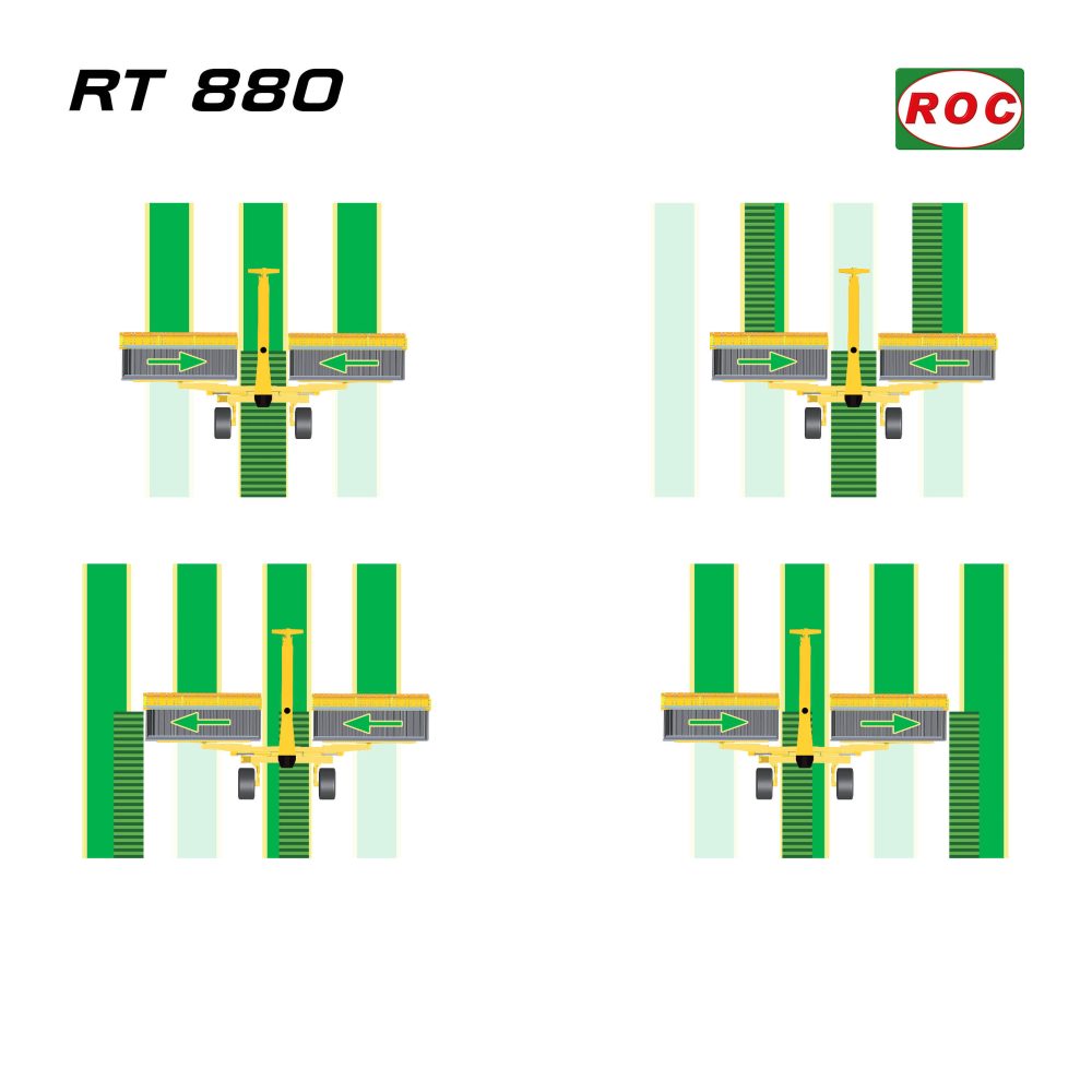 Le ramasseur-andaineur RT 880 est composé de 2 éléments, avec une distance de 1,5 m (5′) l’un de l’autre, pour une largeur de travail de 8,85 m (29′) et une largeur de récoltre de 7,3 m (24′). Ce modèle donne la possibilité de décharger les deux tapis dans le centre, ou sur les deux côtés, ou un tapis dans le centre et l’autre tapis sur un côté. La machine est équipé  de pneumatiques 520/50 R 17. Cette version peut travailler avec un ou tous les deux éléments ouverts et elle est repliable jusqu’à 3 m de largeur pour le transport sur route (9′ 10 »).